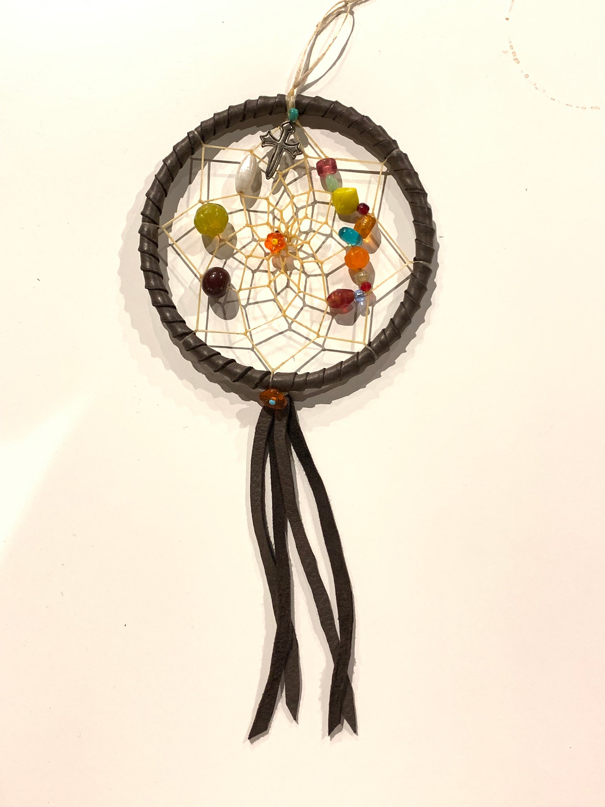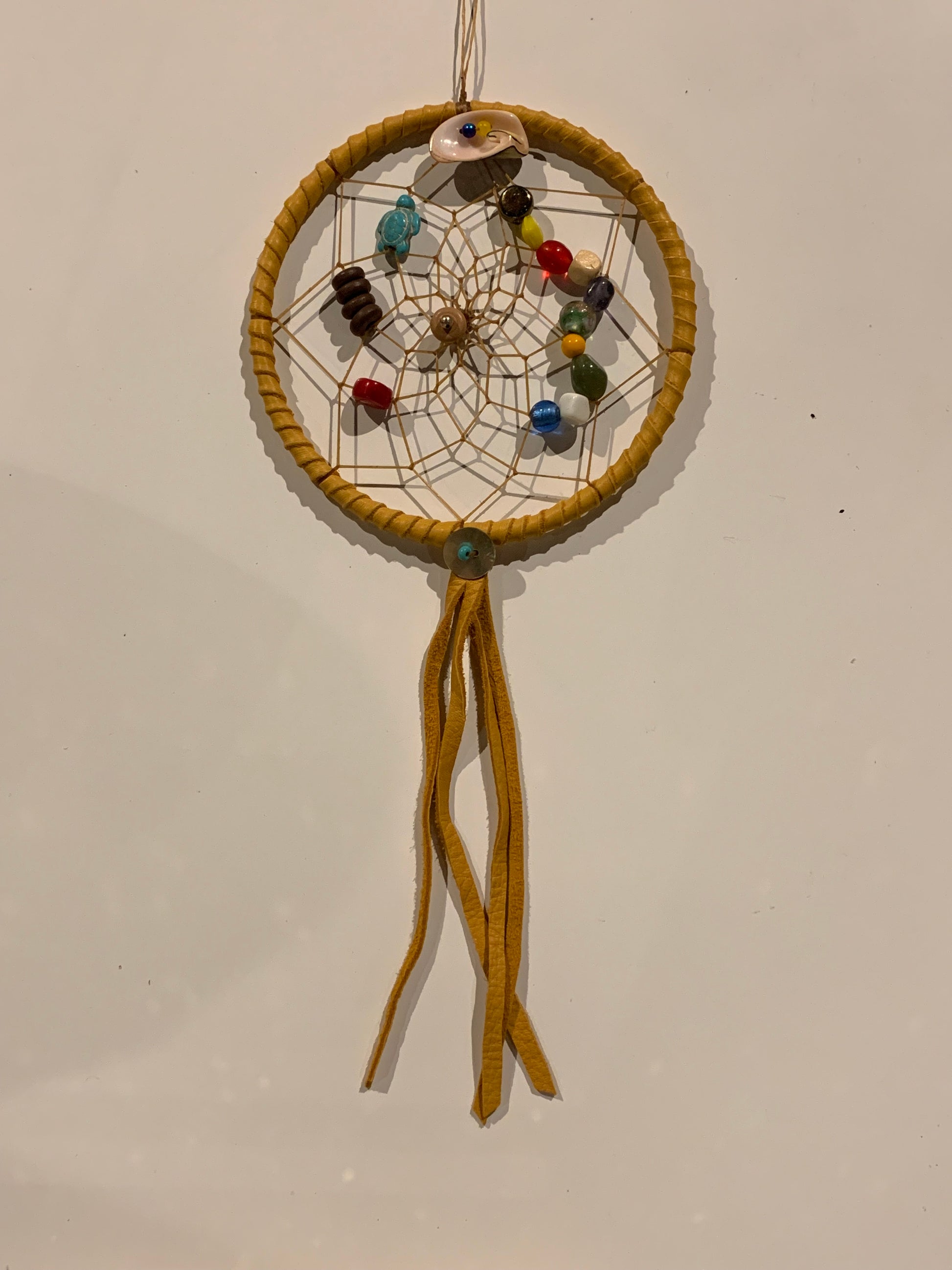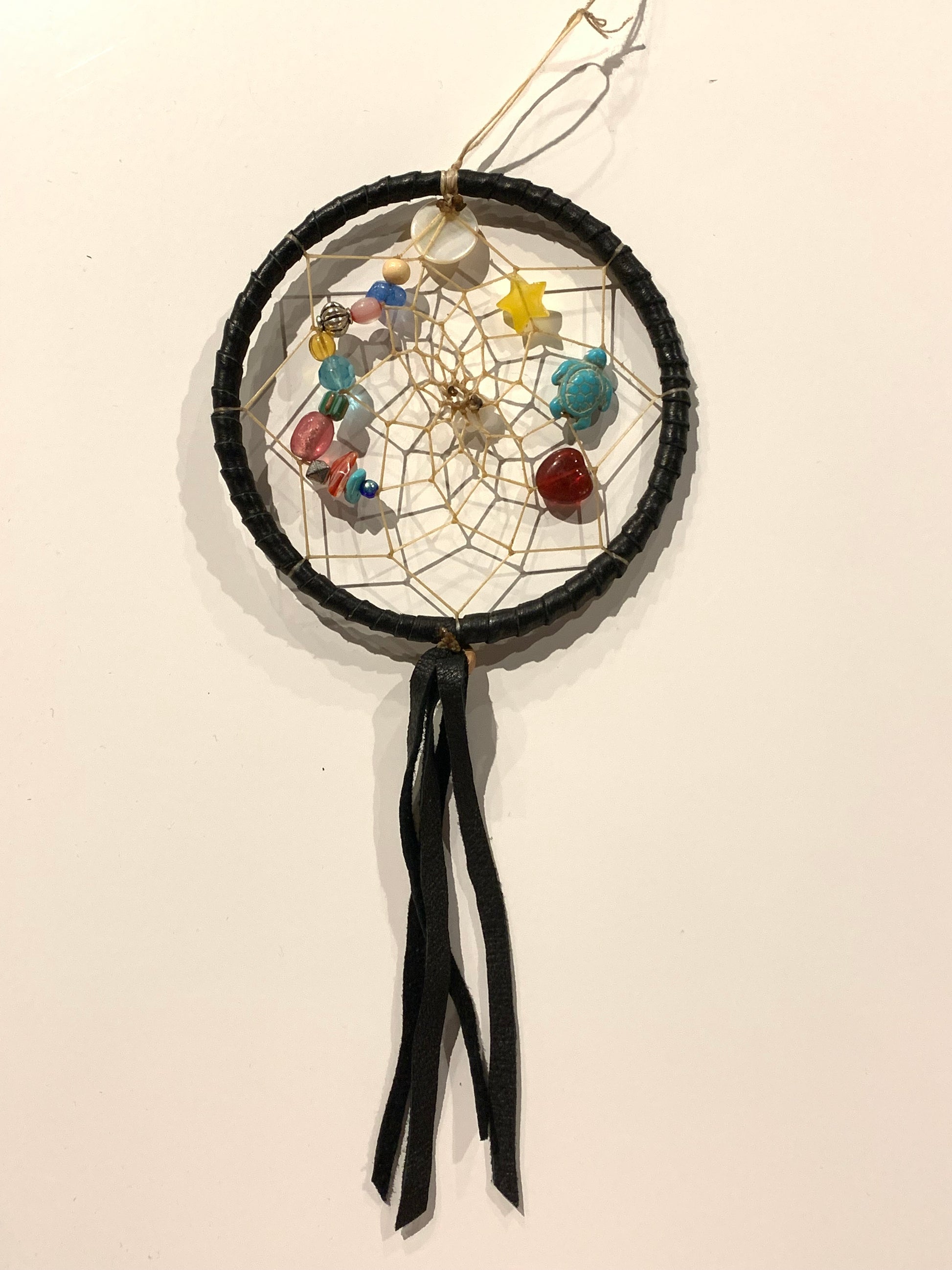 These leather dream nets were created by artist Cynthia Holmes, an enrolled member of the St. Croix Reservation.