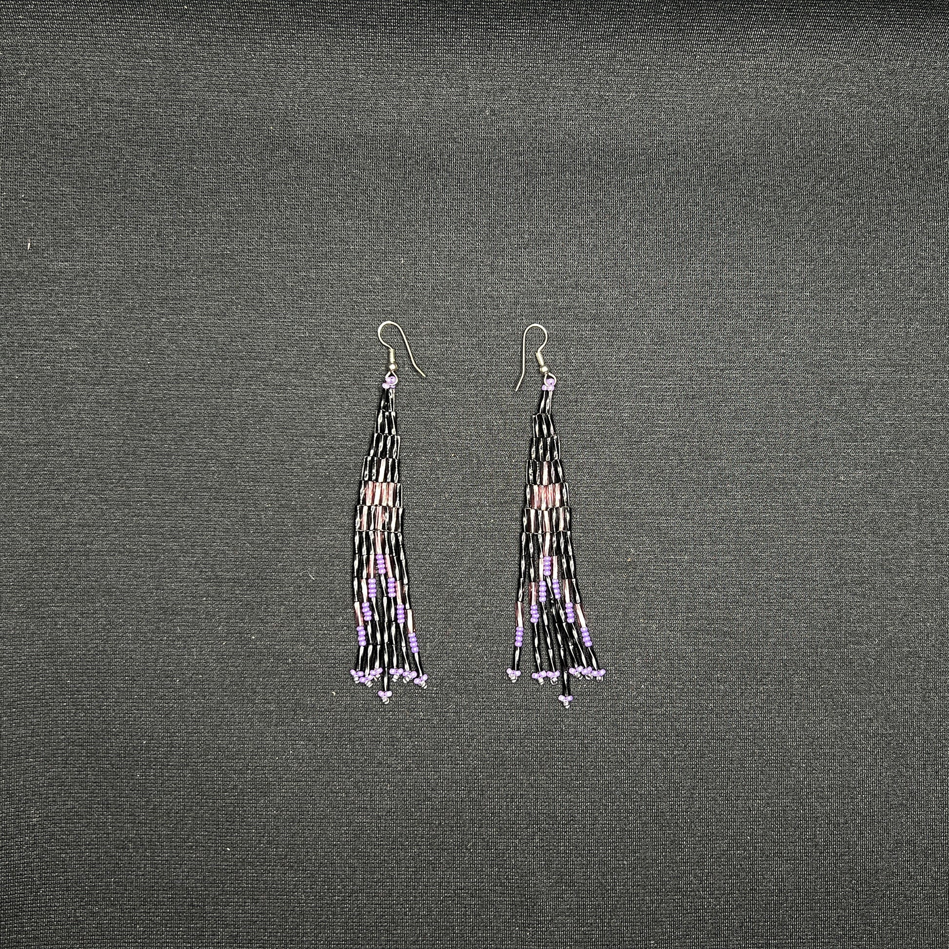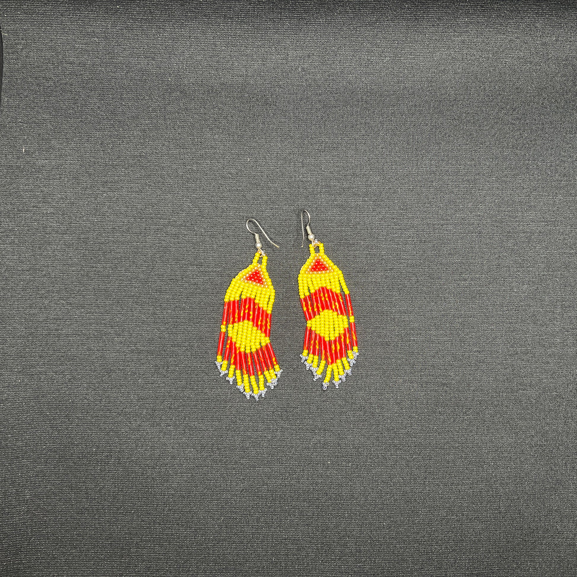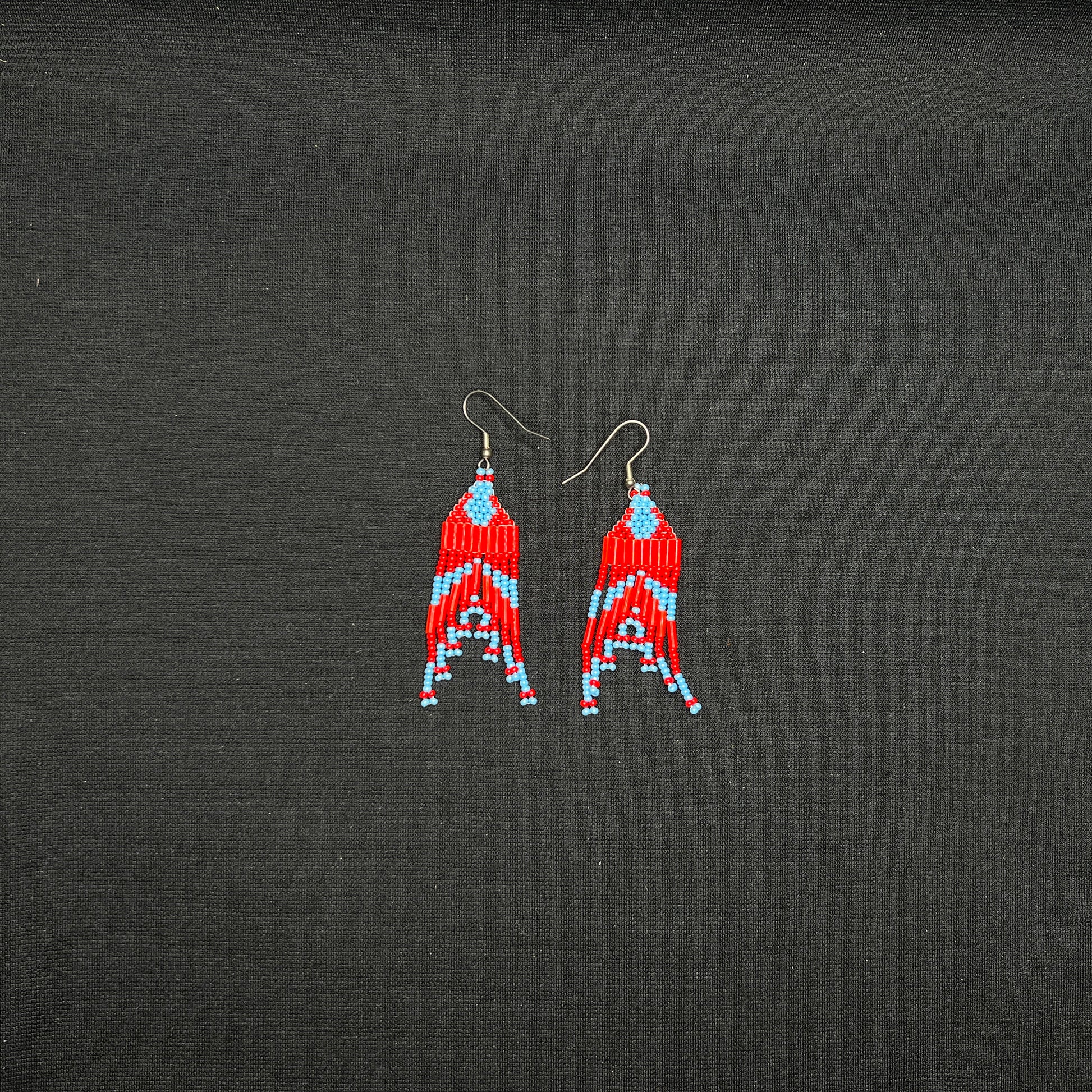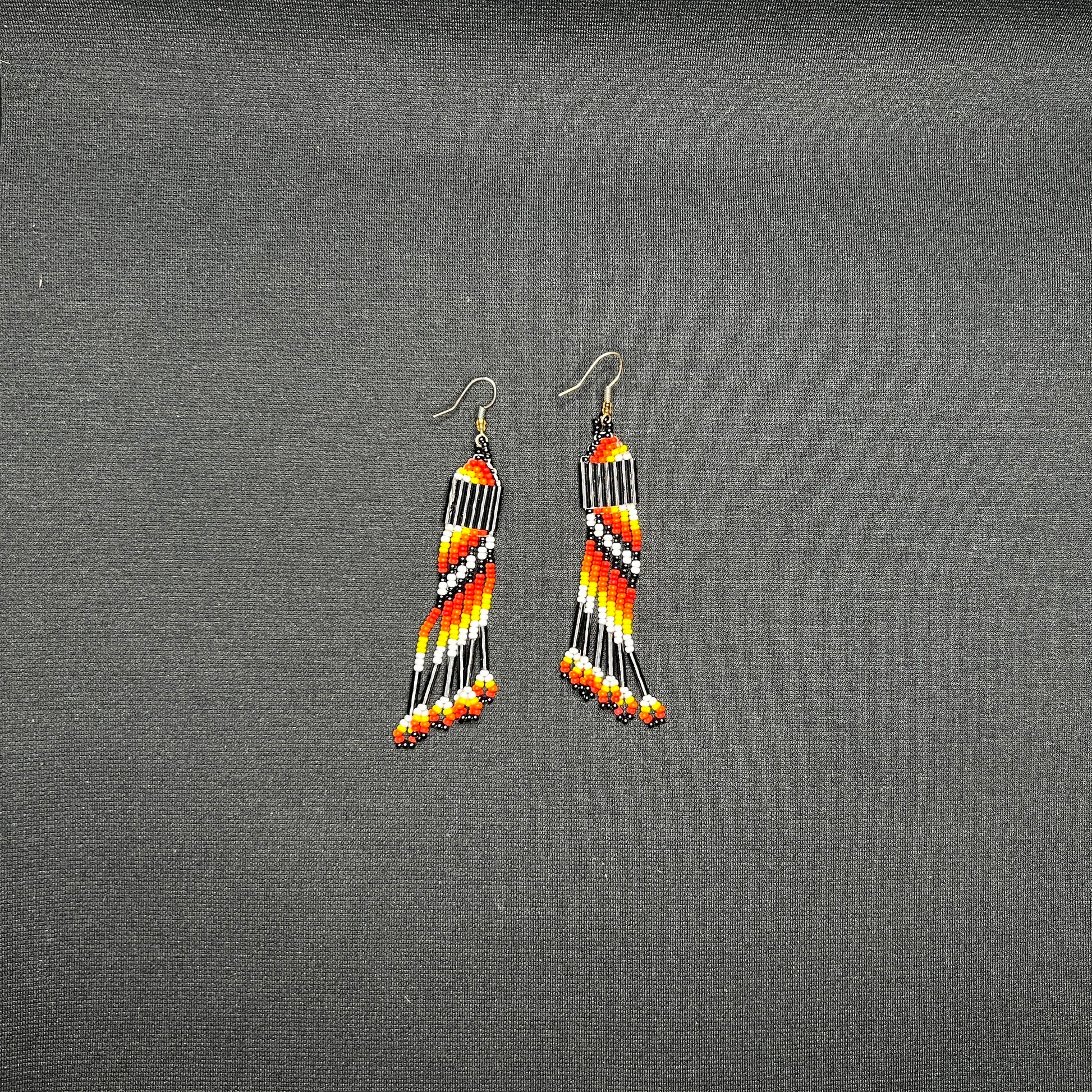 These earrings are beaded in a chandelier style and were supplied to Intertribal Creatives by All Relations United, a 501(c)3 nonprofit organization that works with the incarcerated Native Men who create these pieces, the beadwork gathered by All Relations United are from Oglala Lakota inmates in the South Dakota Penitentiary- community support allows them to have an income and support their families.