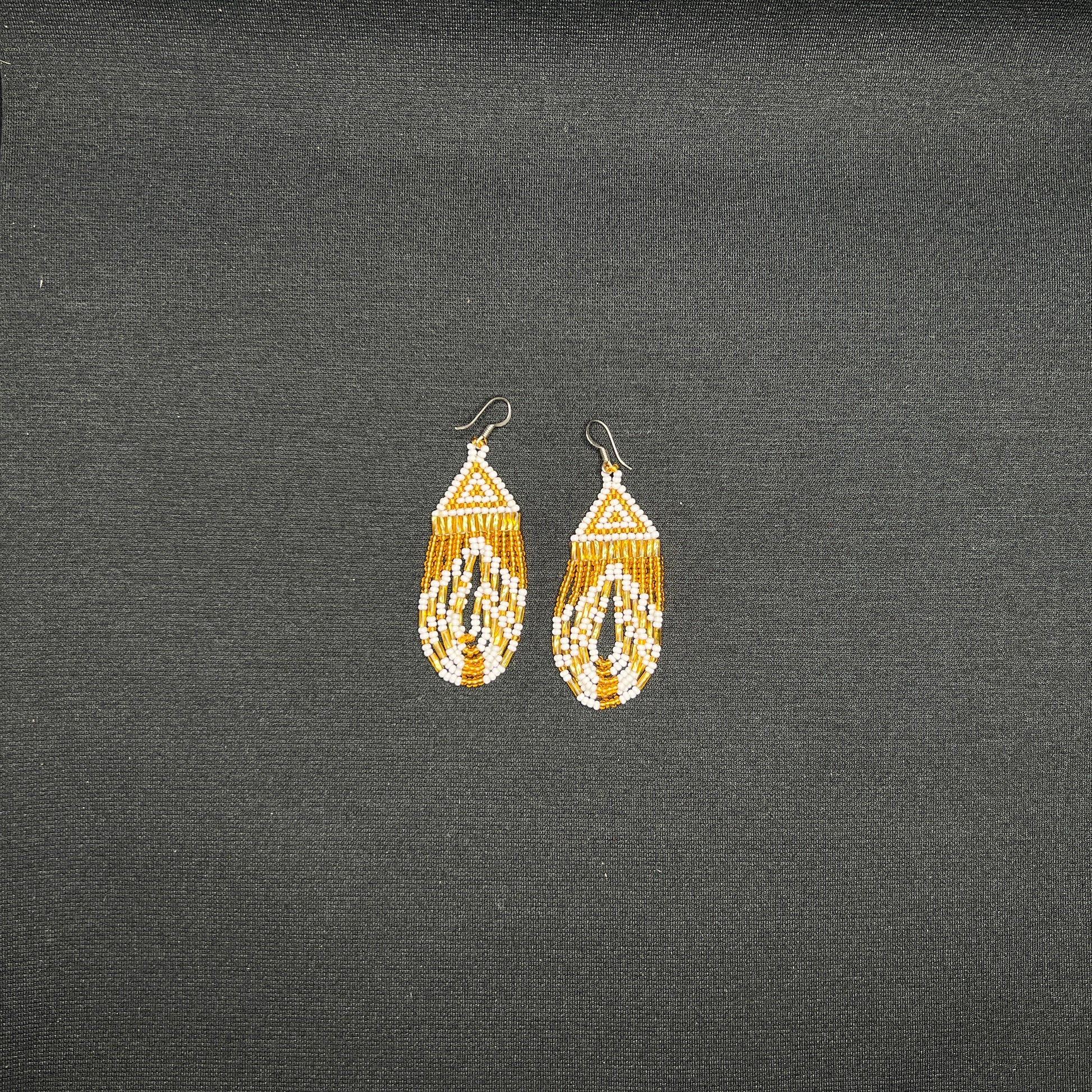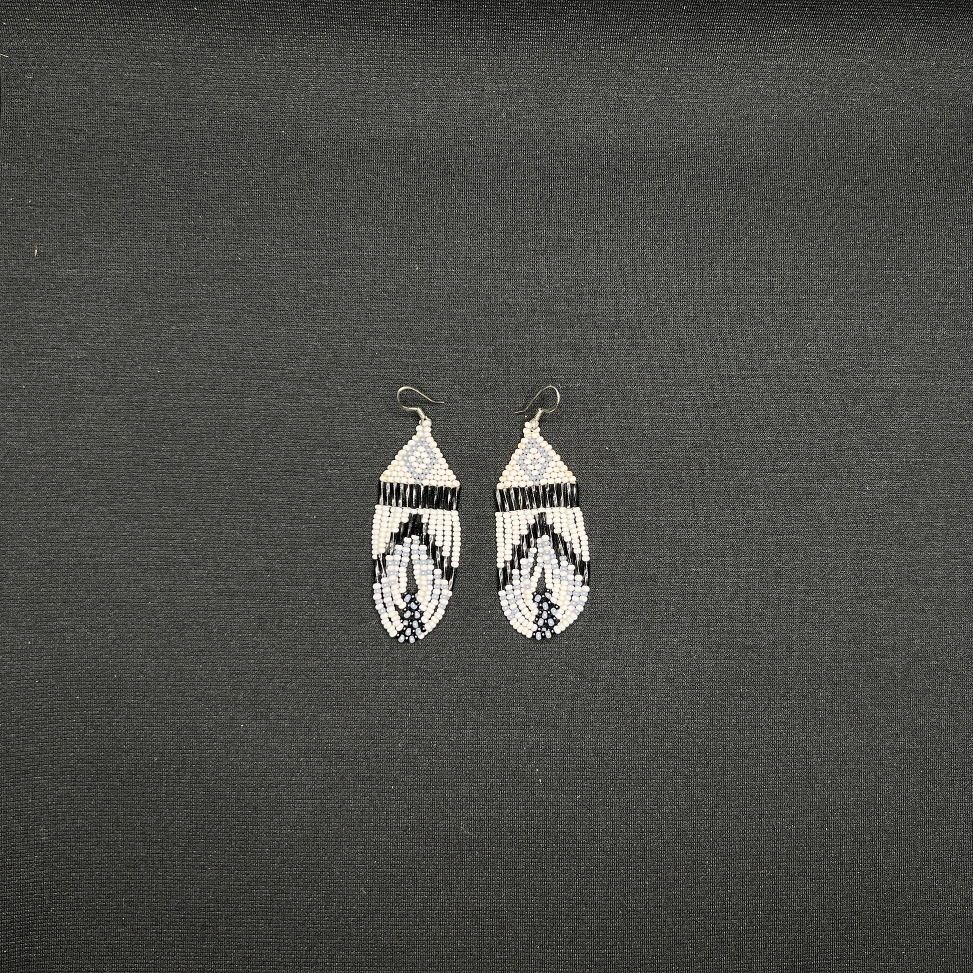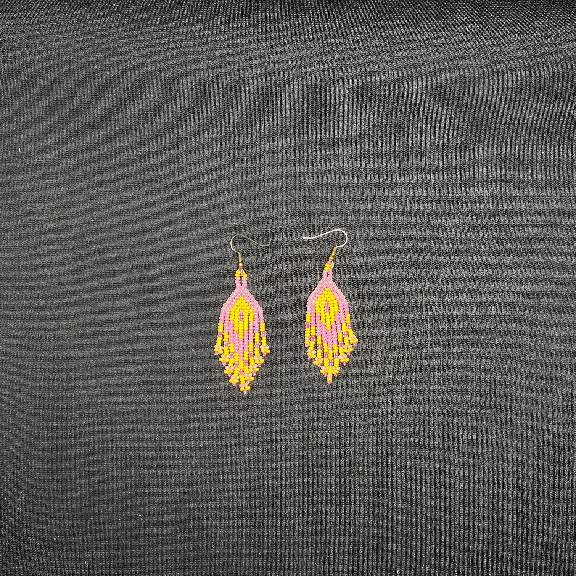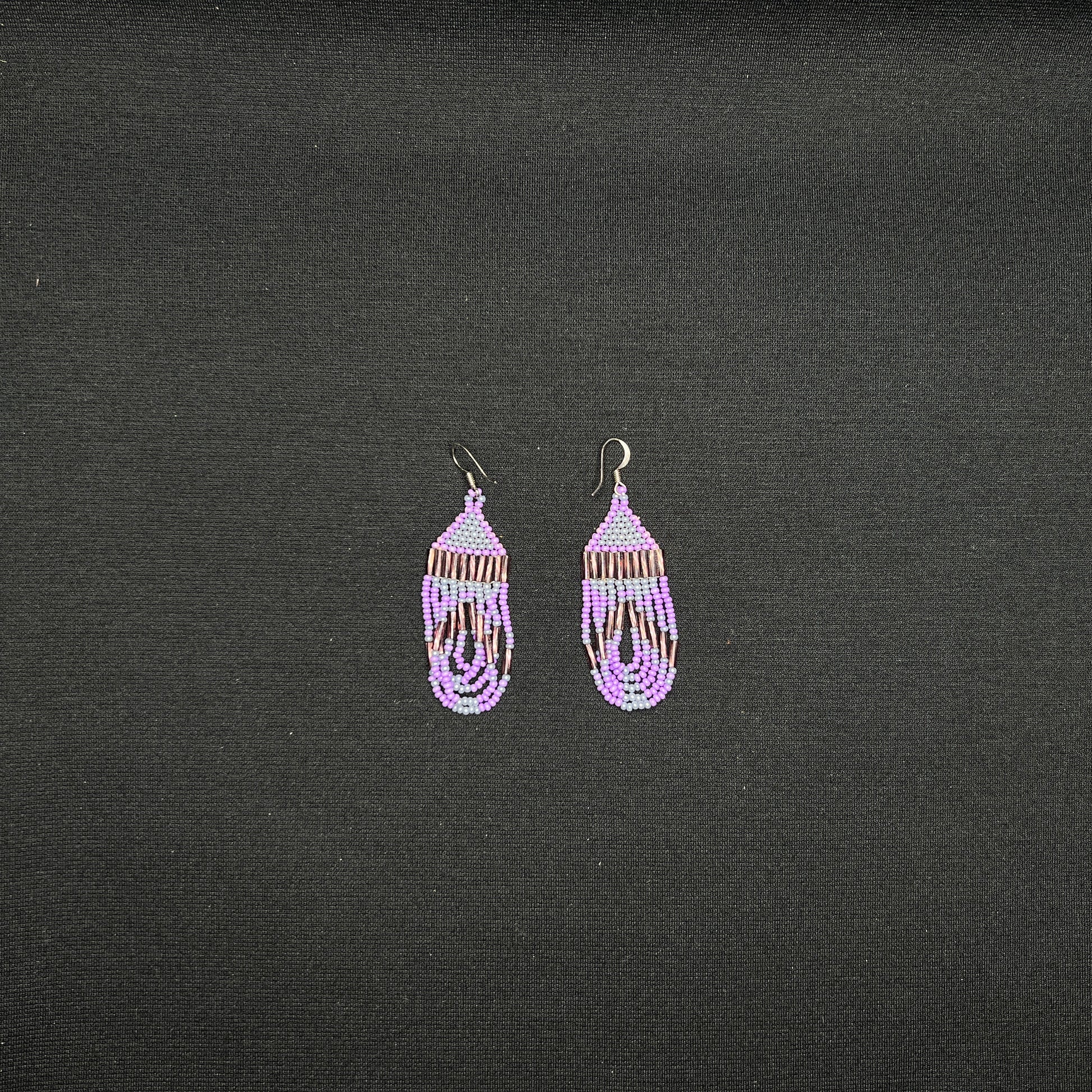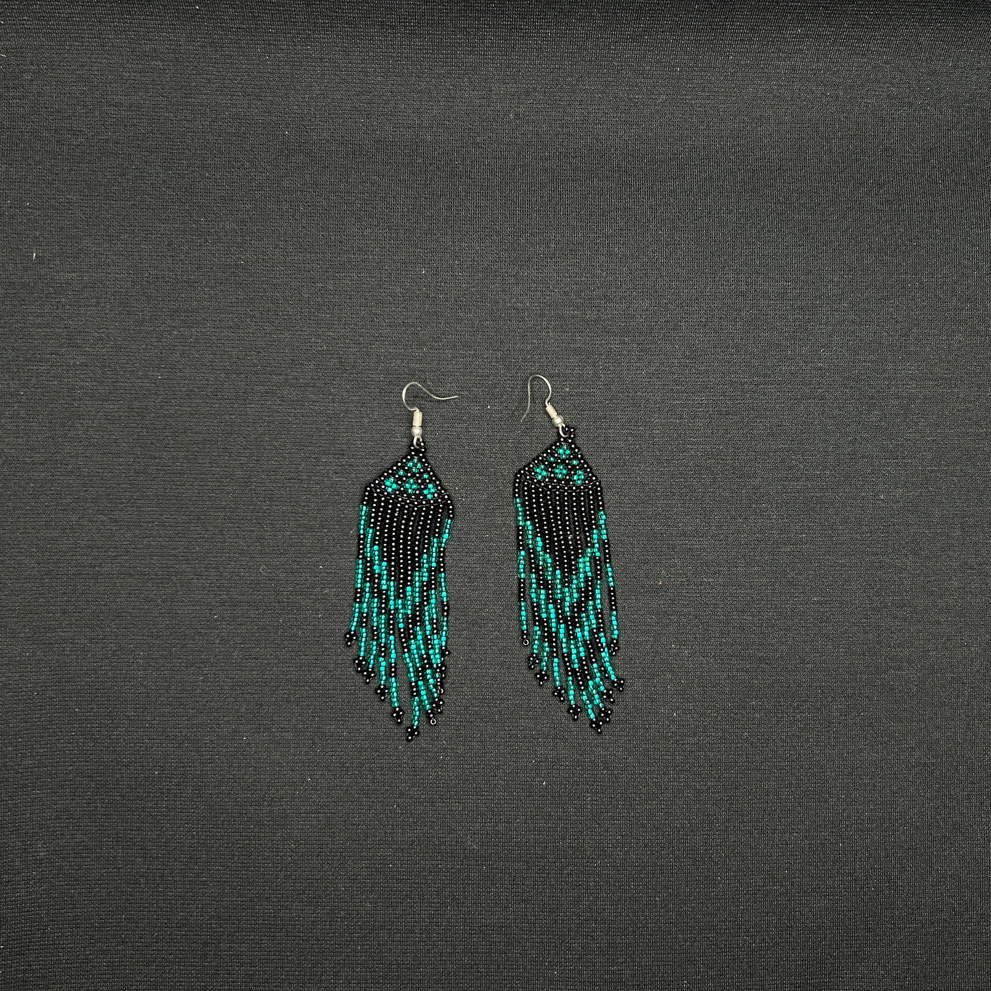 These earrings are beaded in a chandelier style and were supplied to Intertribal Creatives by All Relations United, a 501(c)3 nonprofit organization that works with the incarcerated Native Men who create these pieces, the beadwork gathered by All Relations United are from Oglala Lakota inmates in the South Dakota Penitentiary- community support allows them to have an income and support their families.