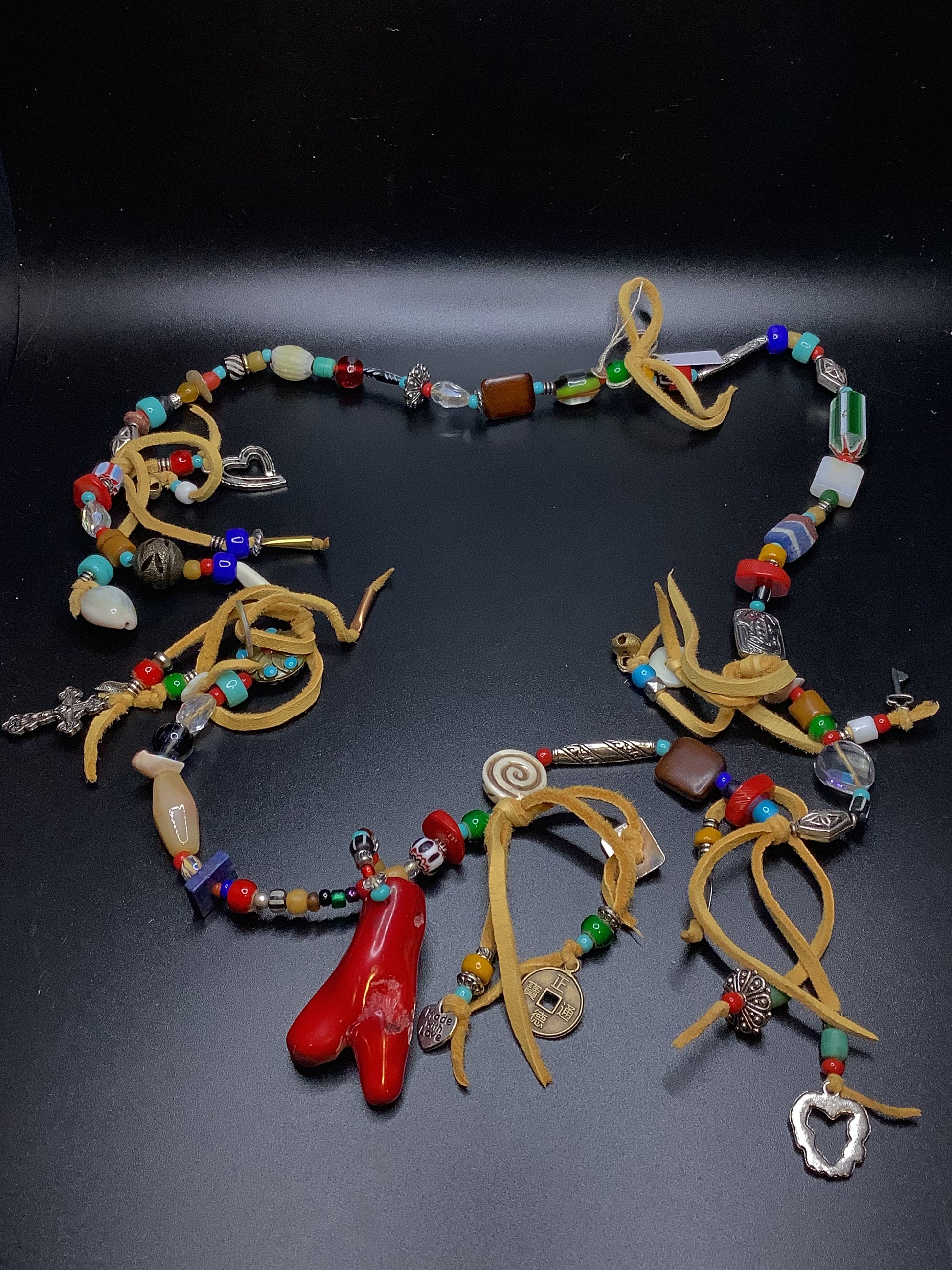 30" necklace with leather fringe and Mediterranean coral focal pendant. Assorted glass, metal, crystals, shell, and other natural stone beads.