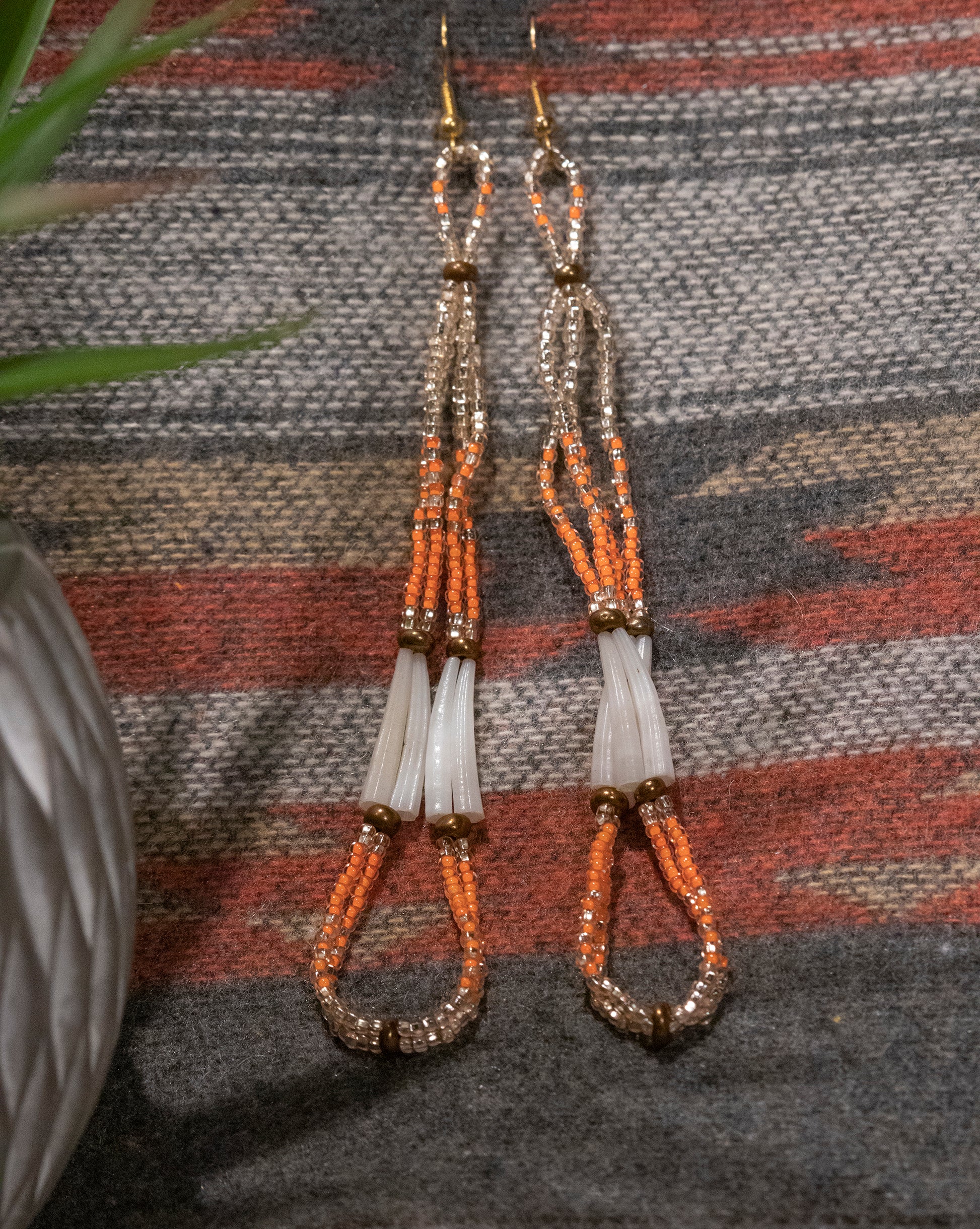 Dentalium and copper loop earrings by Eva Angus. They feature clear, orange, and gold, and copper beads. They are hung from gold hooks.