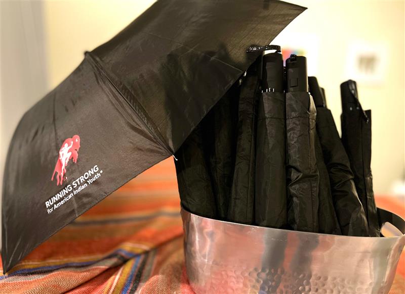 Black retractable umbrella with the Running Strong for American Indian Youth Logo.